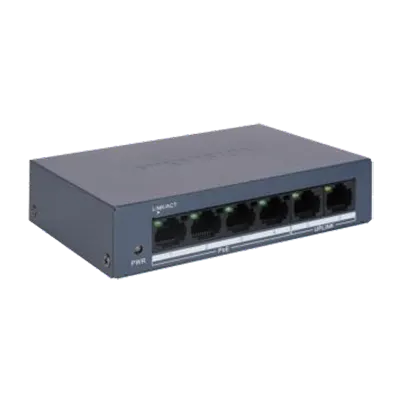 Hikvision DS-3E0106MP-E/M 4 Port Fast Ethernet Unmanaged PoE Switch, 4 × 10/100 Mbps PoE RJ45 ports and 2 × 10/100 Mbps RJ45 ports, Auto MDI/MDIX of ports, Store-and-forward switching mode, Auto MAC address learning and aging, Intelligent cache optimization, MAC Address Table: 2K, Switching Capacity: 1.2 Gbps, Packet Forwarding Rate: 0.89 Mpps, Internal Cache: 768 Kbits, PoE Power Budget: 45 W, 48 VDC, Metal.