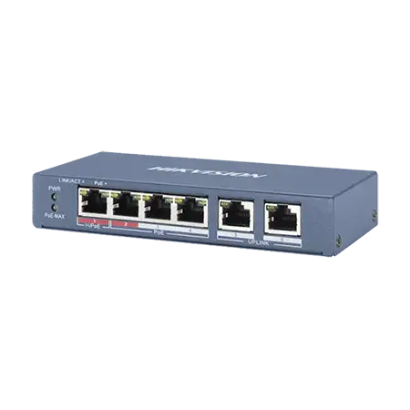 Hikvision L2 Unmanaged 4-Ports 10/100M RJ45 PoE Switch, 2-Ports 10/100M RJ45 uplink port, 802.3af/at, PoE power budget 35W, max. 300m long distance transmission, 6KV surge protection.