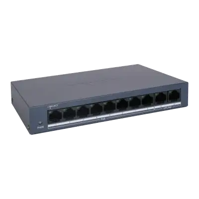 Hikvision DS-3E0110MP-E/M 8 Port Fast Ethernet Unmanaged PoE Switch, 8 × 10/100 Mbps PoE RJ45 ports and 2 × 10/100 Mbps RJ45 ports, Auto MDI/MDIX of ports, Store-and-forward switching mode, Auto MAC address learning and aging, MAC Address Table: 2K, Switching Capacity: 1.6 Gbps, Packet Forwarding Rate: 1.19 Mpps, Internal Cache: 768 Kbit, PoE Power Budget: 60 W, Metal material, 48 VDC.