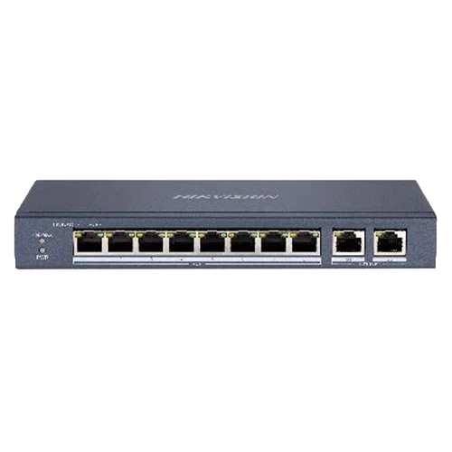 Hikvision L2 Unmanaged Switch, 8 10/100M RJ45 PoE ports, 2 Gigabit RJ45 uplink ports, 802.3af/at, PoE power budget 60W, max. 300m long distance transmission, 6KV surge ,48 VDC, 1.35A