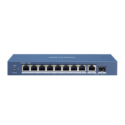 Hikvision 8-Port Gigabit L2 Unmanaged PoE Switch, 1 Gigabit RJ45 uplink port, 1 Gigabit SFP uplink port, 802.3af/at, Store-and-forward switching, PoE power budget 110w